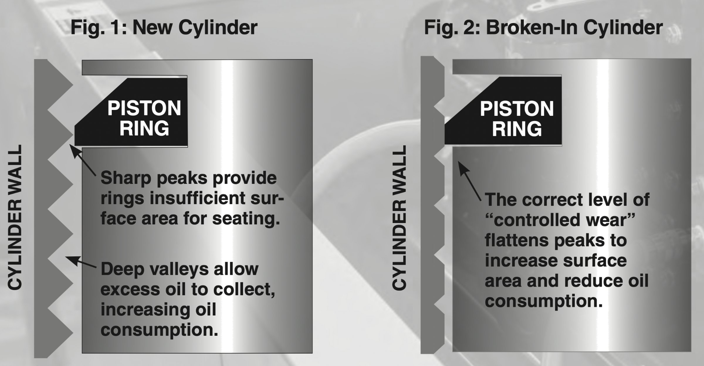 The primary goal during engine break-in is to seat the rings against the cylinder wall. Properly seated rings increase compression, resulting in maximum horsepower; they reduce oil consumption and prevent hot combustion gases from entering the crankcase. To achieve this, the oil must allow the correct level of "controlled wear" to occur between the cylinder wall/ring interface while maintaining wear protection on other critical engine parts. Insufficient break-in leaves behind peaks on the cylinder wall that prevent the rings from seating. The deeper